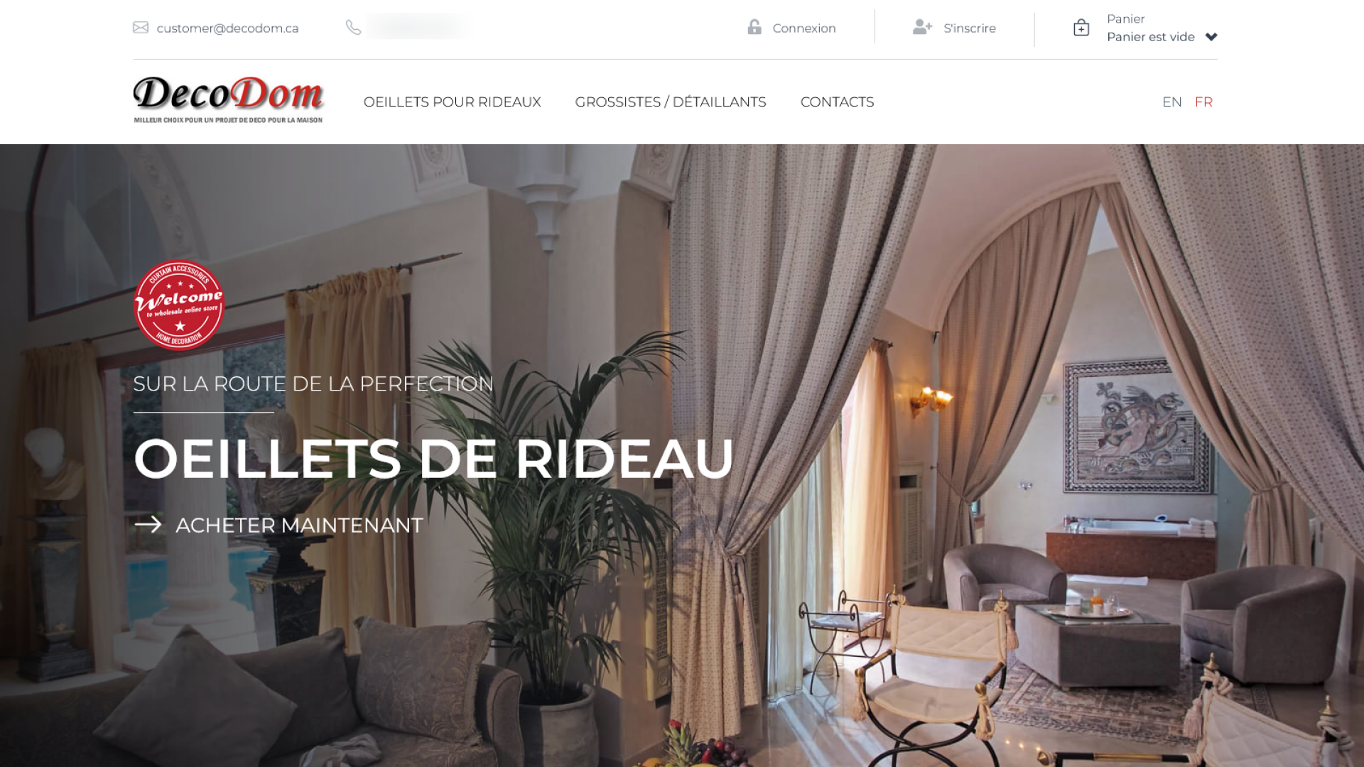 Caractéristiques principales : Stock important : Plus de 9 000 accessoires pour rideaux, principalement des œillets. Plateforme conviviale : La boutique en ligne est hébergée sur une plateforme e-commerce professionnelle, facile à utiliser, avec un design moderne et une interface réactive.