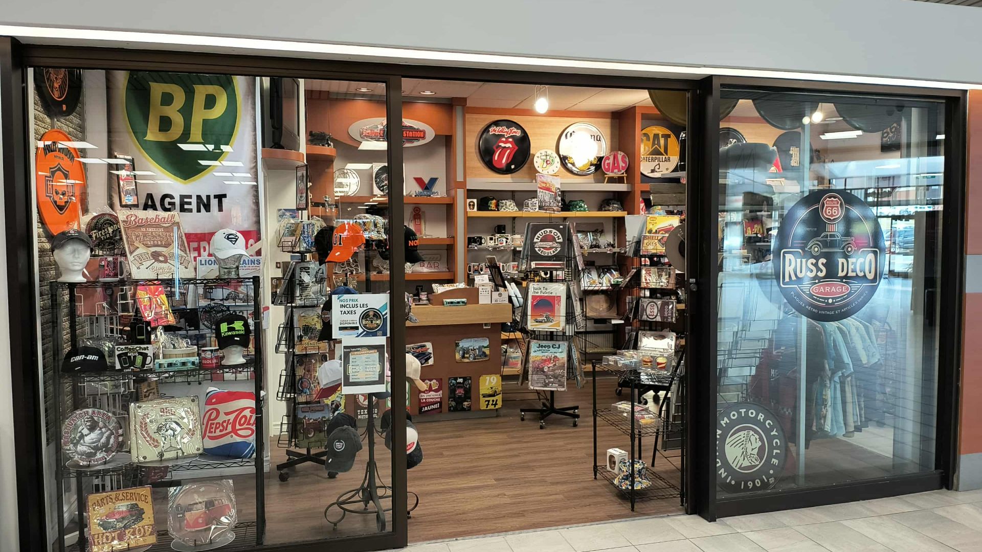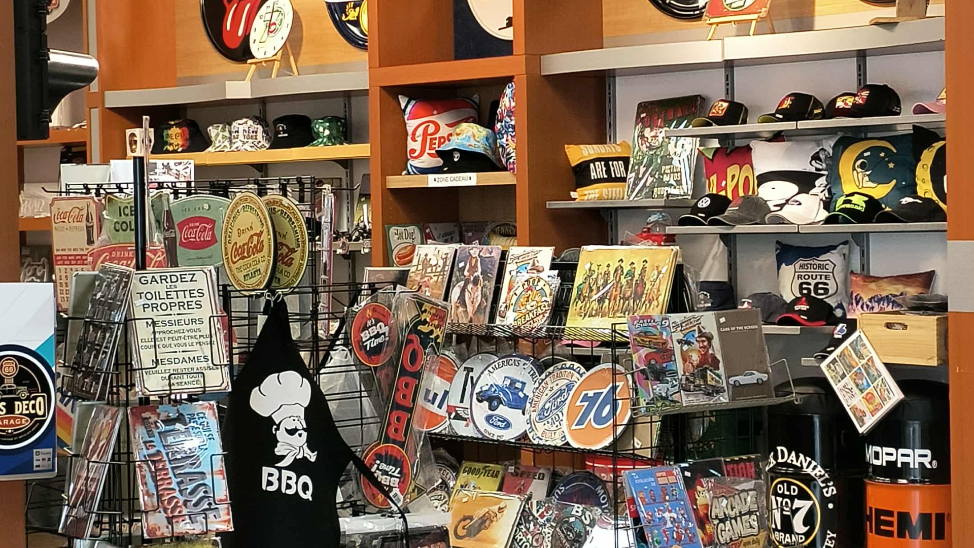 assortiment de plaque et articles déco et reproduction et aussi originale collection, casquettes , coussins pour decoration de garage salon,chambres ,et autres produits divers etc.