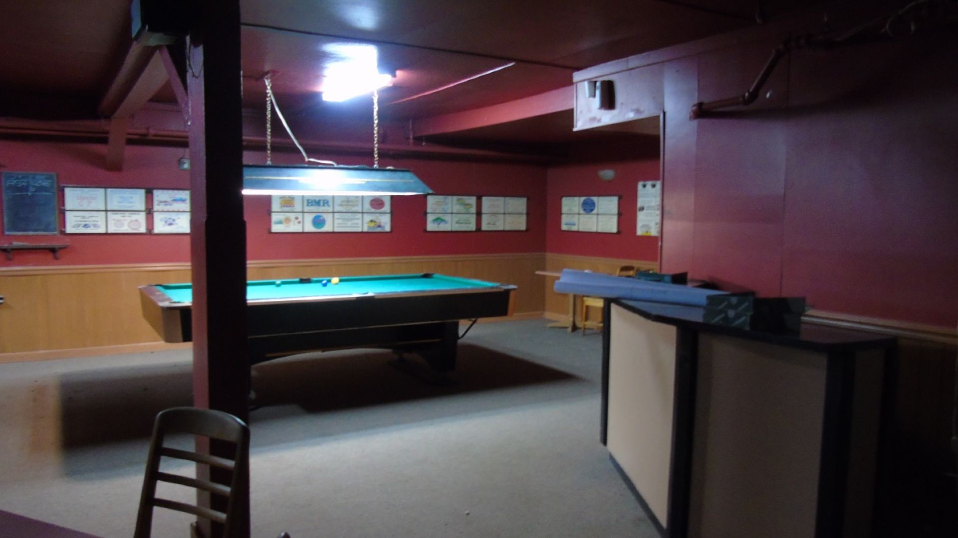 Bar (chambre froide, frigos, tout le matériel inclus), projecteur, écrans plats, 3 tables de billard professionnelles.